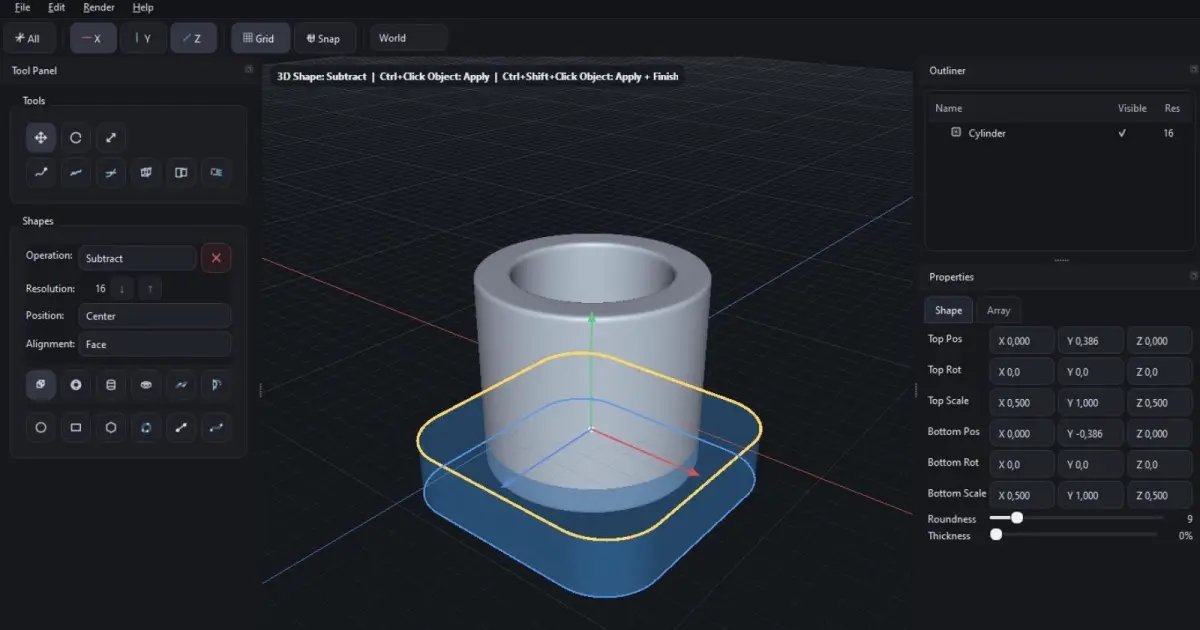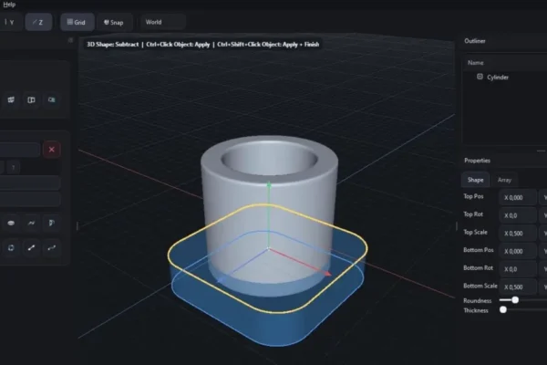 Ferramenta de modelagem 3D para superfícies duras usando voxels e SDFs, acelerando a criação de ativos mecânicos para jogos e design industrial.