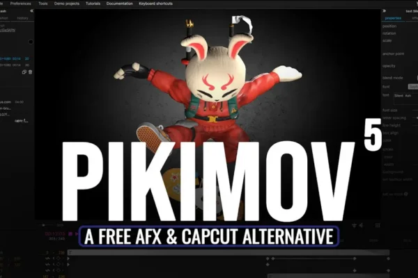 PikiMov 5 é um editor gratuito online para motion graphics e edição de vídeo com suporte 3D, keyframes e múltiplos modos de composição.